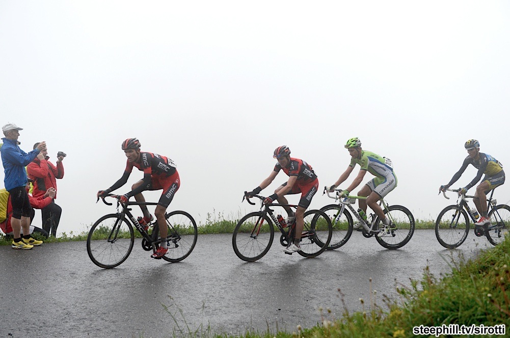 來到最後20km 的一級坡,兔子只剩Michael Albasini (ORICA) 獨行...Tejay Van Garderen (BMC) 帶著瑞士人我隊友Matthias Fränk (BMC), Peter Sagan (Cannondale), Roman Kreuziger (Saxo-Tinkoff) 追出來
