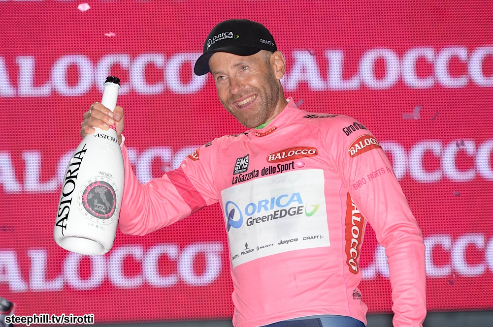 正好,陣中老將Svein Tuft 37 歲大壽,全隊就把maglia rosa 讓給他穿,當成生日禮物